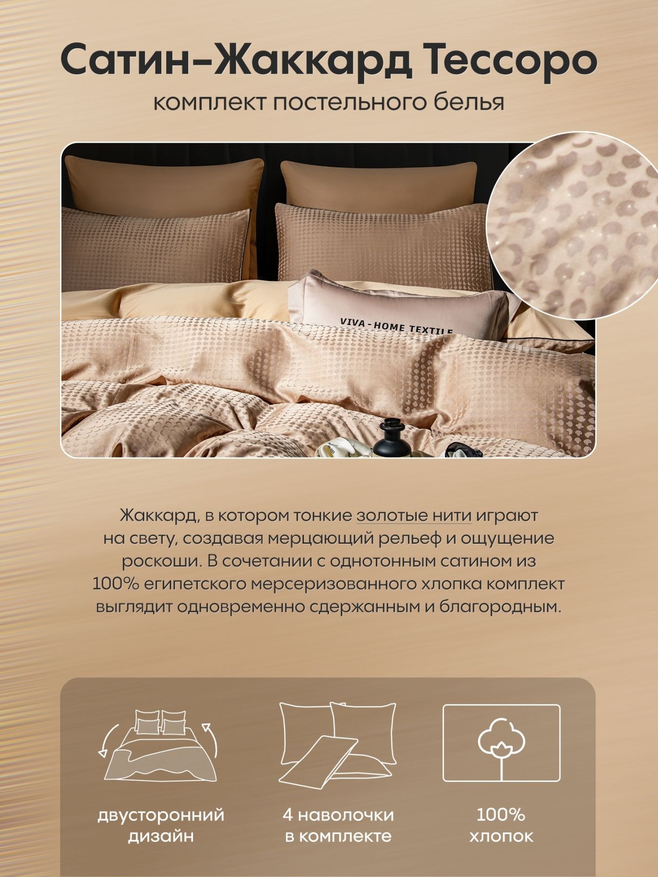 - Пододеяльник двусторонний: жаккард сверху и сатин снизу для максимального комфорта.