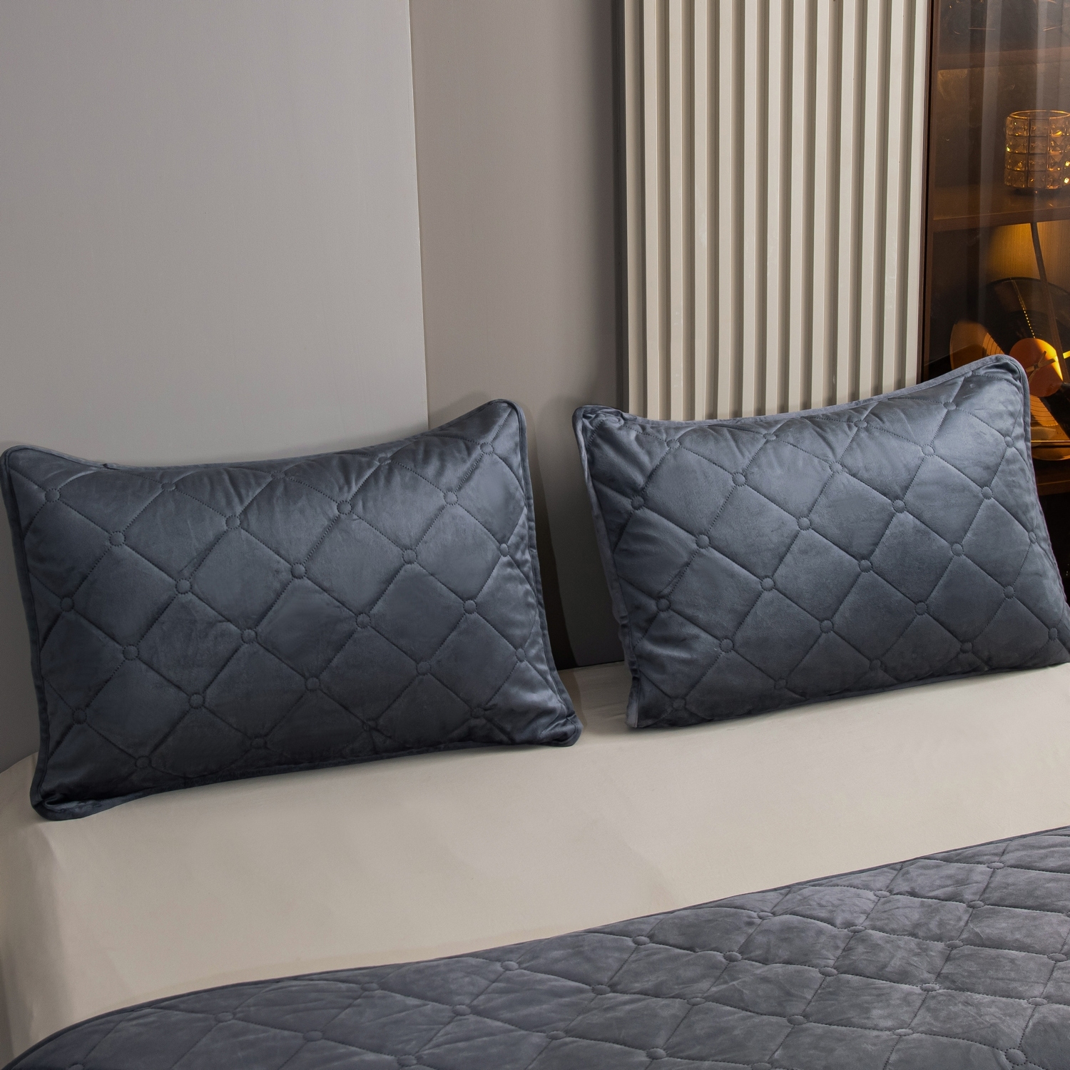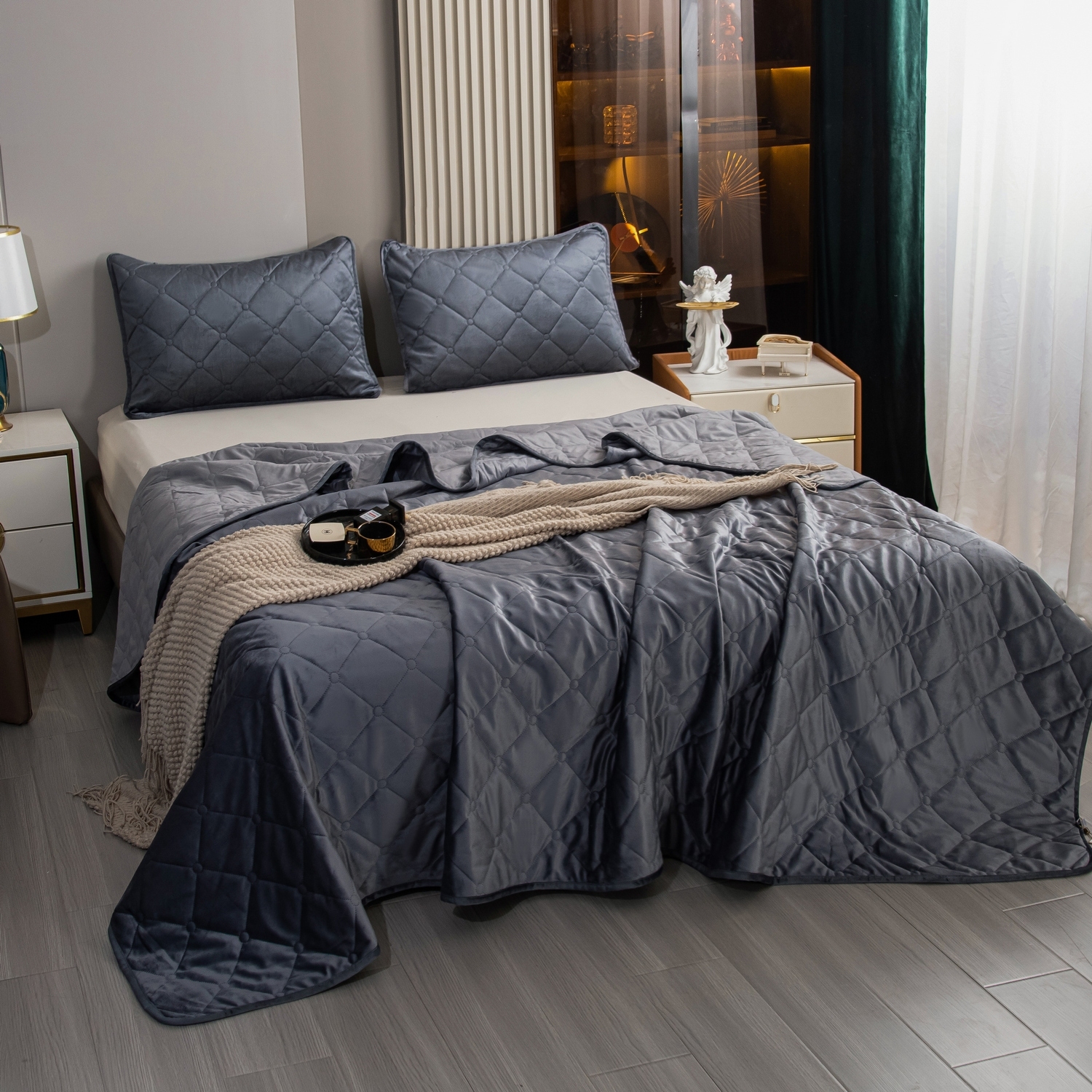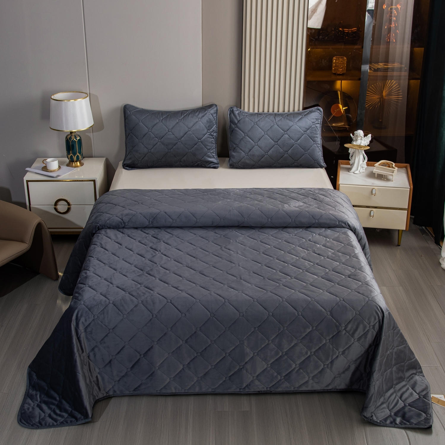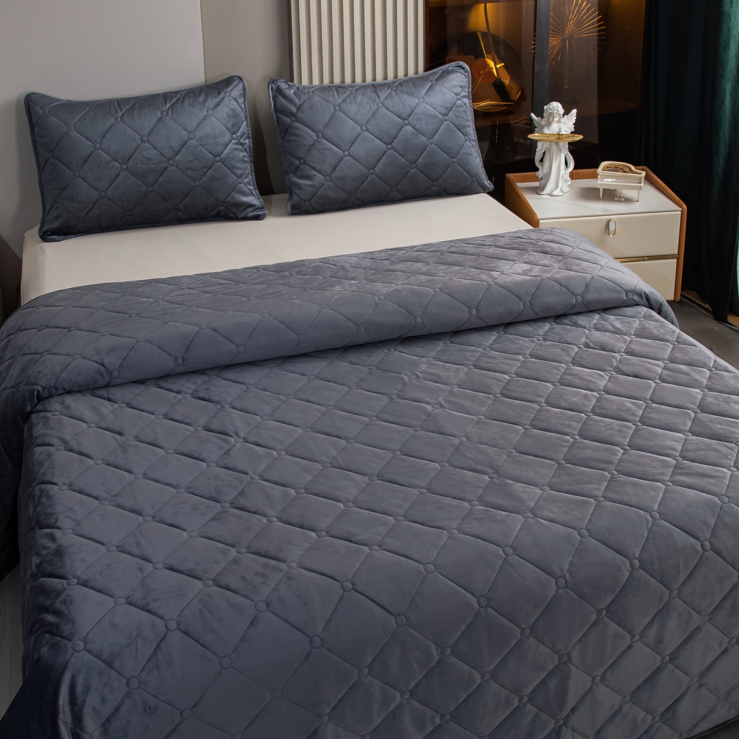 Покрывало украшено стежкой "Ромб" с металлизированной нитью, что подчеркнёт стиль постели и окружающего её пространства.